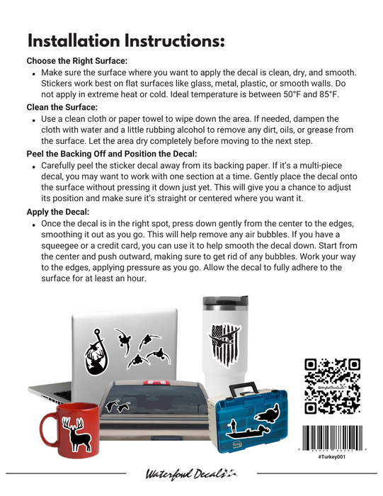 Getting your decals in place is simple. Each sticker comes precision-cut to match the design—no transfer tape required. Just clean and dry your surface, peel the backing, and apply. Smooth it out from the center for a bubble-free finish. Whether it’s a gun case, laptop, or tailgate, these decals adhere strong and remove clean if you ever want to switch things up.